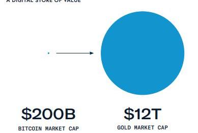 “黃金的市值目前超過12萬億美元,比特幣的市值目前約為2000億美元,不到黃金市場的2%。如果比特幣作為價值資產的替代性數字存儲增長到黃金的水平,那么這將提供超過60倍的市場擴展機會。”