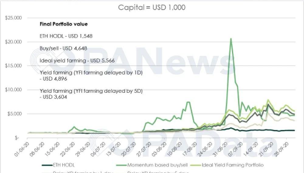 正如我們在下圖中所看到的,如果YFI代幣收益耕作拖延一天,那么最終的投資組合收益將減少64%。從絕對值來說,理想的收益耕作最終投資組合價值將會達到48,011美元,而如果延遲一天,這一數字就會驟減到17,267美元。