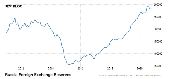 在 2019 - 2020 年期間,隨著黃金價格大幅上漲,俄羅斯的外匯儲備也隨之上升,如下圖所示: