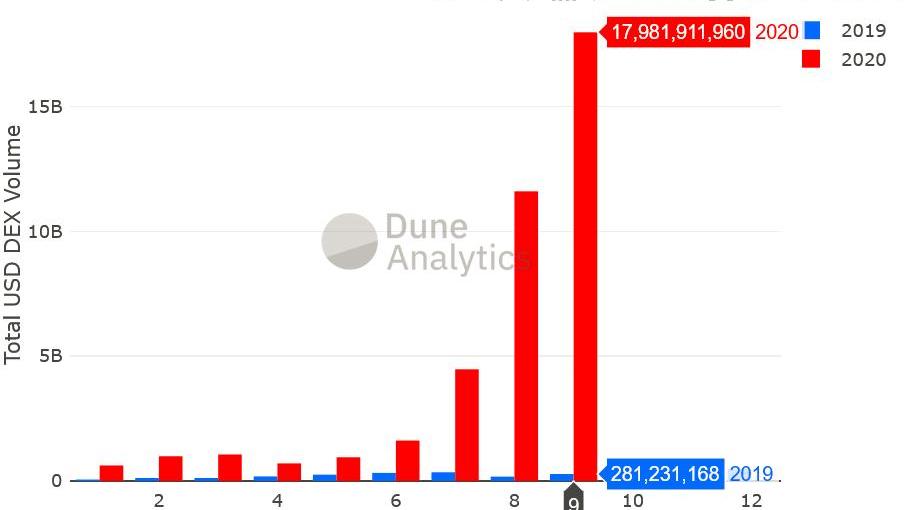 我們以2019年9月份的數據為例,全網DEX成交量為2.81億美元,2020年9月份截止20日,這一數據為179.82億美元,預估整個9月份成交量將達到280億美元左右,是2.81億的100倍。