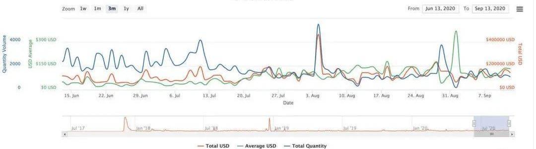 而NFT的交易量,也不溫不火,自3年前CryptoKitties短暫高光引得以太坊堵到動彈不得,2020年的NFT市場,熱度也才剛剛抬升。