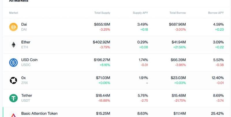 而實現債權合約的價值基礎是超額抵押,借幣利率則反應了抵押物項目的市場風險和違約風險,舉例下圖為Compound市場在2020年9月3日的鎖倉利率和借幣利率:
