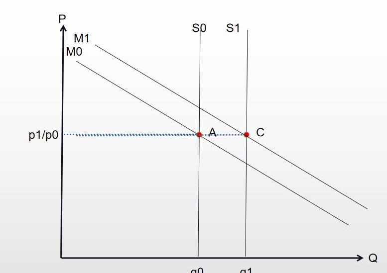 上圖為微觀經濟學中常用的供給與需求分析,橫軸為數量用Q表示,縱軸為價格用P表示,S0表示供給曲線,M0表示需求曲線,A點為Sushi幣供給與需求平衡時的均衡點。