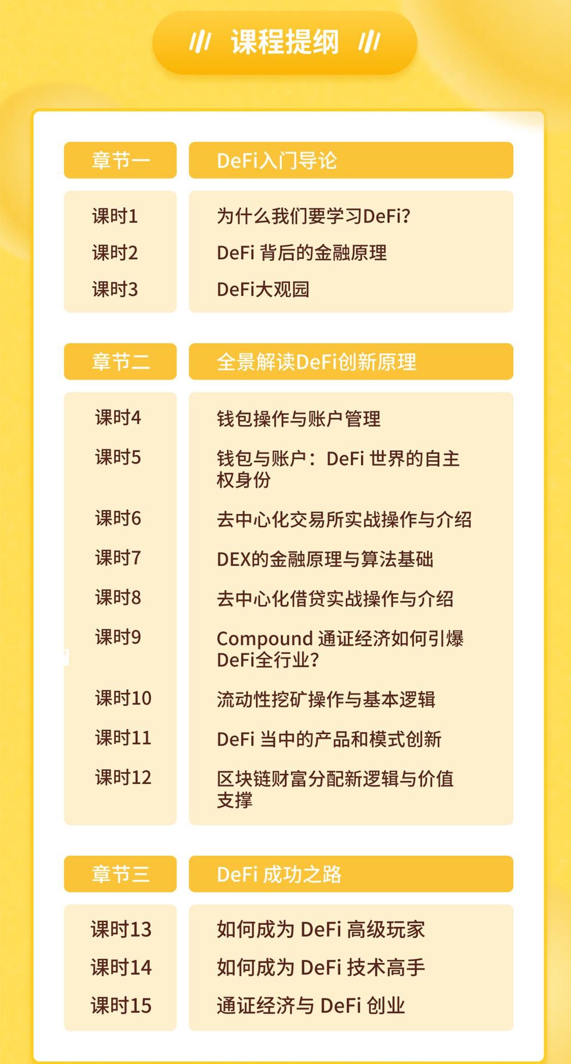 14天的學習,包含DeFi的基本介紹,背后的金融理論,頭部DeFi項目介紹,DeFi的線上操作、DeFi的價值邏輯等等全維度的內容,從簡單到復雜。