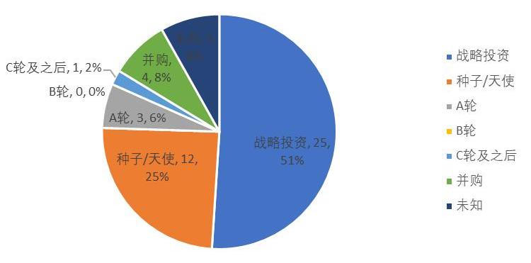 從2020年融資輪次整體分布情況看,戰略投資占比始終超過50%;種子/天使輪占比近三個月穩中有升,A輪/B輪融資比例有所下滑。