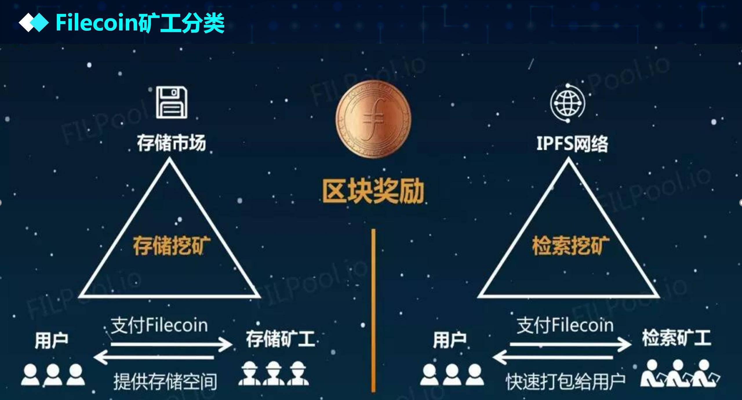 Filecoin的礦工分為兩類,一類是存儲礦工:用戶給到存儲礦工FIL,礦工提供存儲空間;一類是檢索礦工:用戶需要通過IPFS網絡獲取文件,給到檢索礦工支付一定費用,然后由礦工檢索出完整的文件給到用戶。目前絕大多數人在講的挖FIL實際是做存儲的事情。關于檢索礦工,在未來兩到三年之后才可能會有檢索的部分。