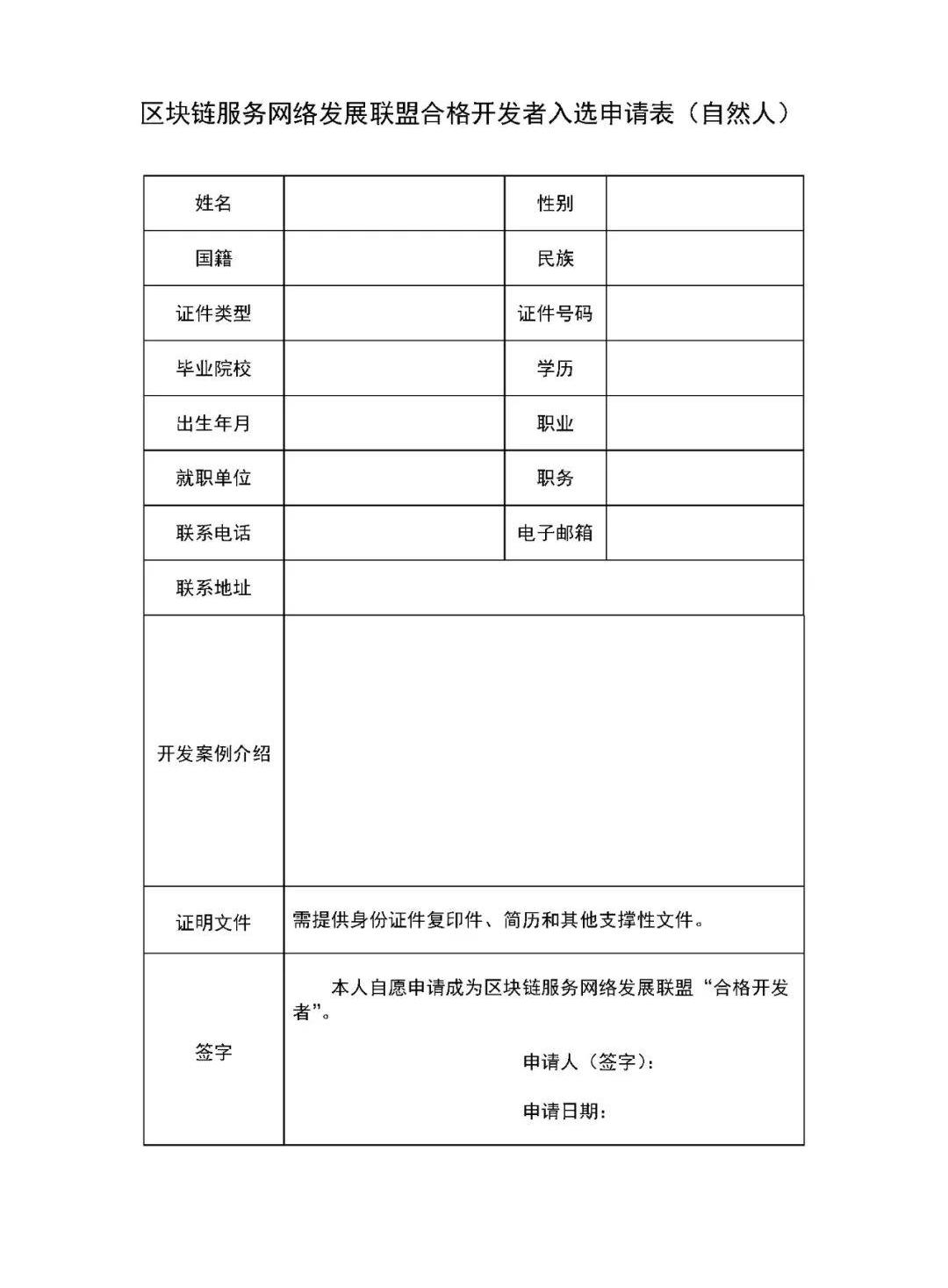 申請者向聯盟開發者委員會提交入選申請材料,包括入選申請表、身份證明文件、營業執照復印件等相關文件。申請表填寫完整后做成PDF文件,并與其他支撐文件打包發至:developer@bsnbase.com;