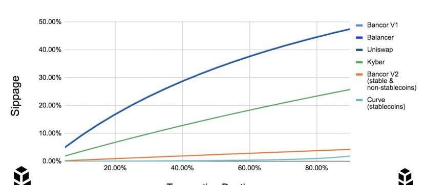 擁有100,000美元儲備的AMM將在10,000美元交易中產生10%的滑點。但是,如果引入Bancor20倍放大,則同一筆交易的滑點將減少到1%。
