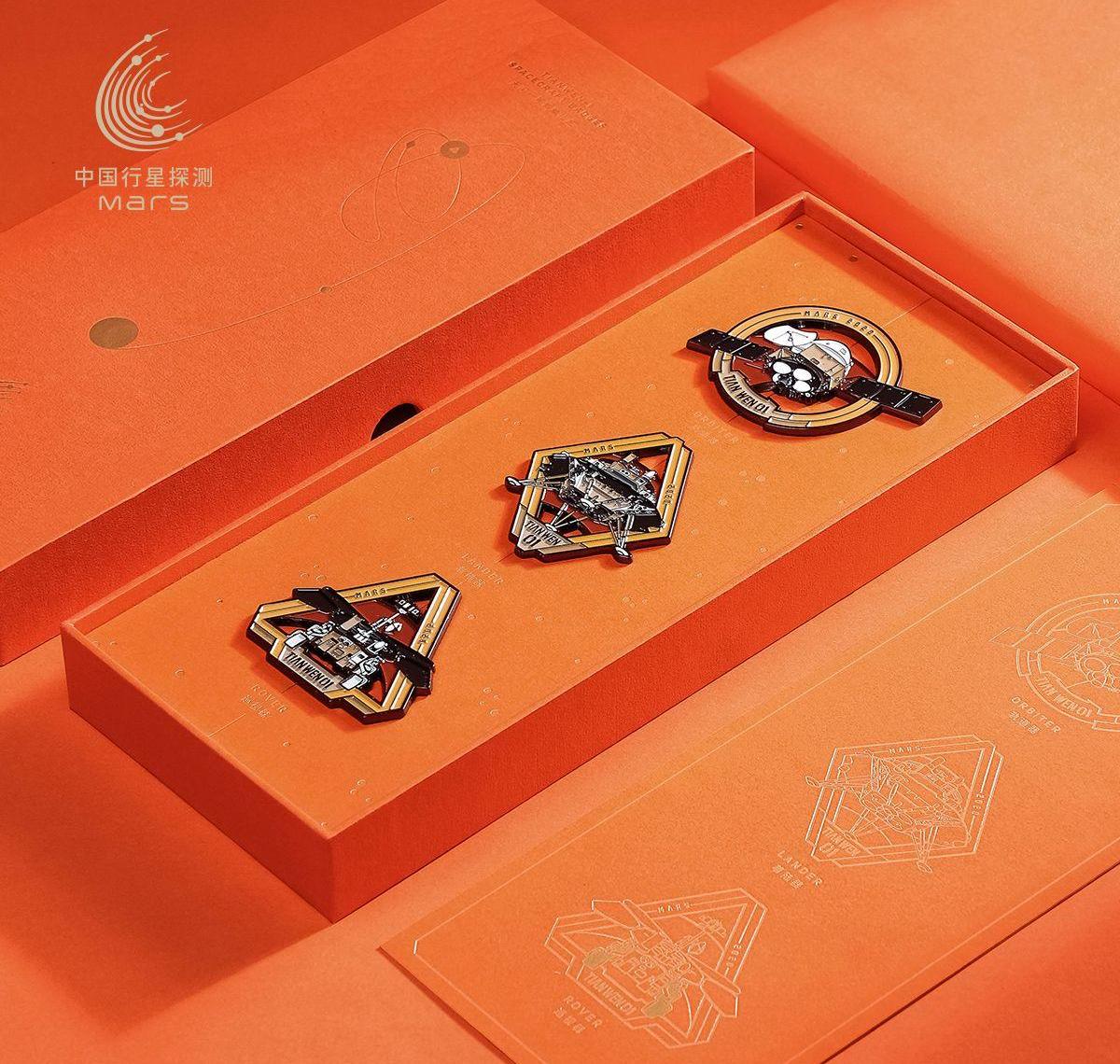 每盒含三枚金屬徽章,包含“天問一號”探測器、著陸巡視平臺和火星車三個樣式