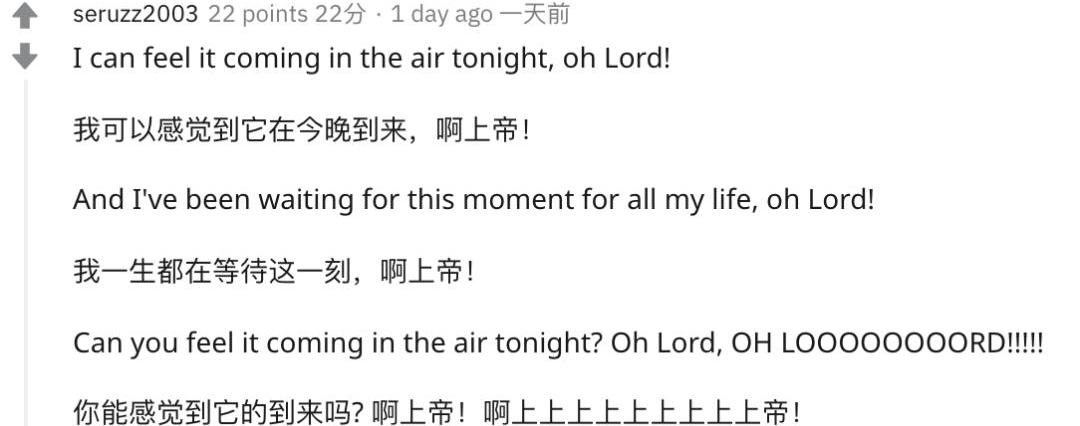 在海外社區Reddit上,有人引用菲爾·柯林斯經典歌曲《Intheairtonight》的歌詞,表達自己的心情:“哦,上帝!我一生都在等待這一時刻。”
