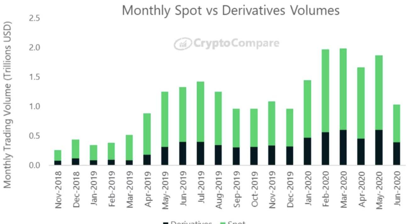 圖:加密市場衍生品和現貨日平均交易量對比(CryptoCompare)