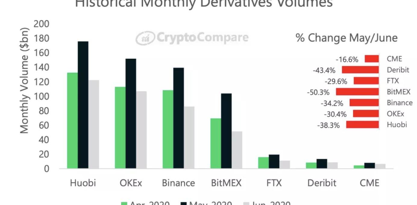 而到了2020年一季度整個衍生品市場成交量更是突破了2萬億美元的大關,較去年四個季度平均值上漲了314%。通過觀察2020年6月的數據我們發現: