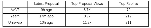 我個人鐘愛的項目AAVE就有個論壇,Yearn和Uniswap也有。我下面羅列的數據某種程度上可以幫您判斷出該論壇是否活躍。您可以選擇更多的間接數據,并自己閱讀論壇討論文章,來判斷該論壇的質量。