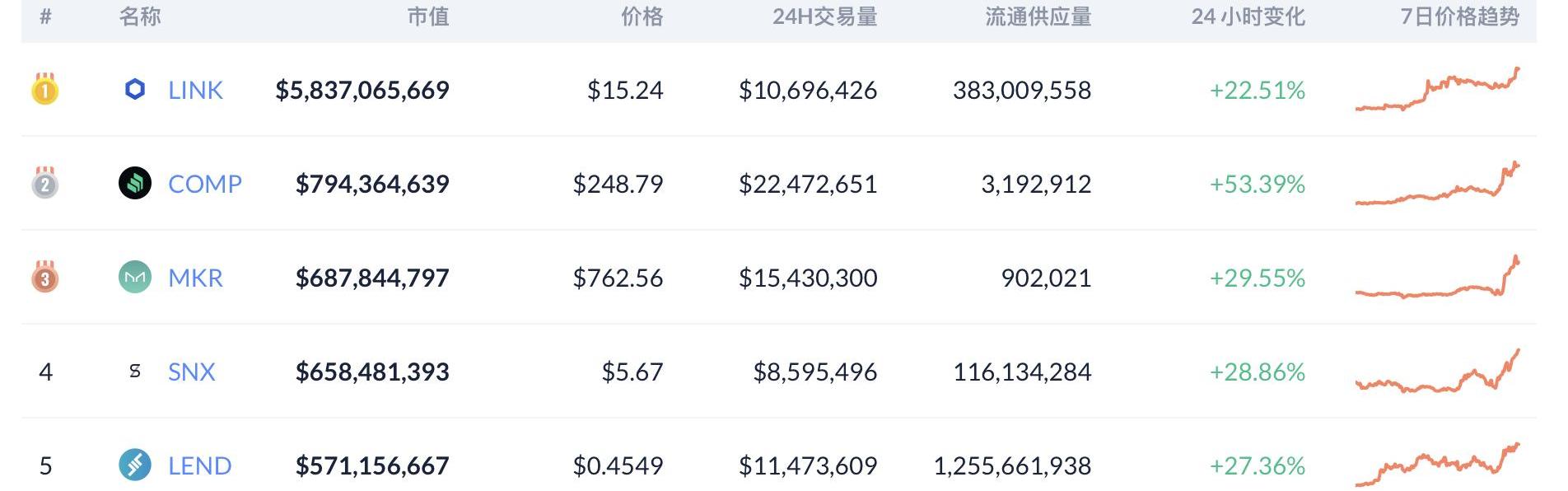 截止發稿時,根據Debank數據顯示,LINK報15.24美元,24小時漲幅22.5%,市值58.3億美元。COMP報244.4美元,24小時漲幅55.05%,市值7.8億美元。MKR報764美元,24小時漲幅29.17%,市值6.89億美元。SNX報5.67美元,24小時漲幅28.8%,市值6.58億美元。LEND報0.45美元,24小時漲幅27.36%,市值5.7億美元。