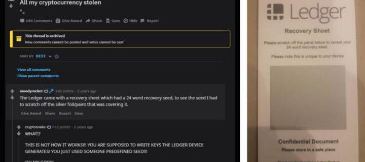 在這種情況下,以上截圖中的受害者,而不是在硬件錢包本身上生成自有的24個單詞的助記詞的錢包買家,就遵循了詐騙者的欺詐性指示。然而,通過包括詐騙者預生成的24個單詞的列表,其就能夠獲取到錢包的訪問權限。
