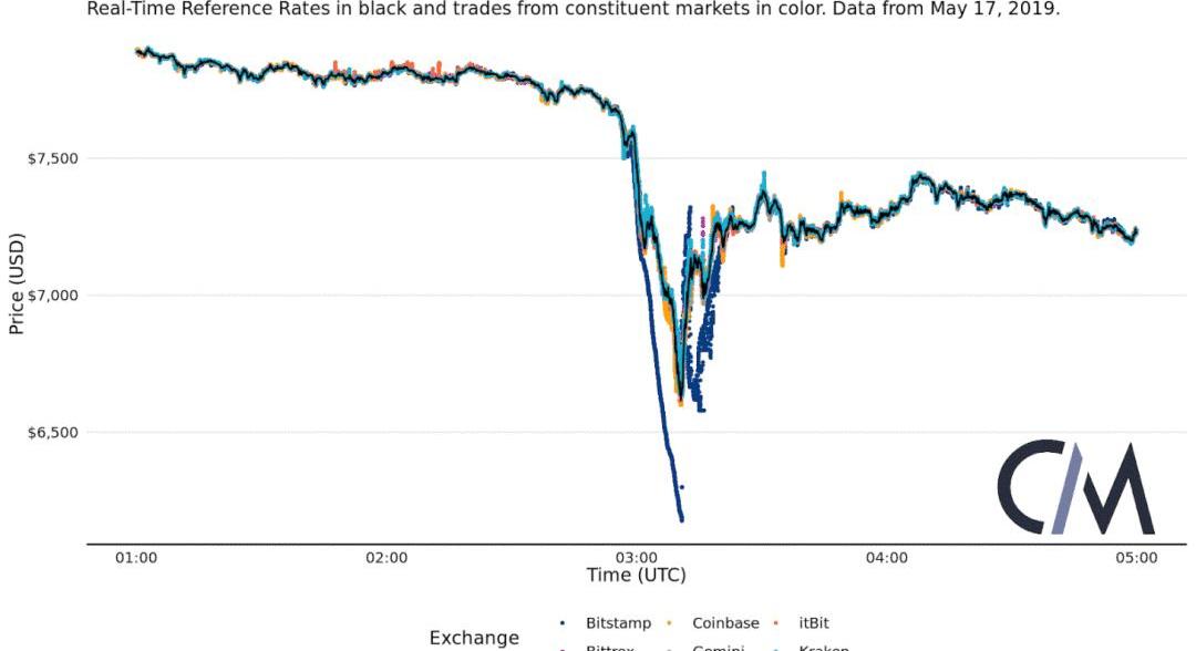 2019年5月17日,比特幣市場經歷了一次可能是由于錯誤下達的大額賣單導致的閃崩。這次閃崩對其發源地交易所Bitstamp的影響尤為強烈。