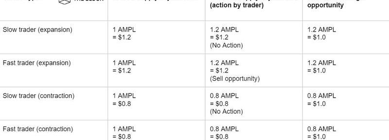 Ampleforth通過"慢"和"快”兩者交易者對價格和供給變化的反應作為例子來說明這一點。下表展現了“Ampleforth逆周期的邏輯“。