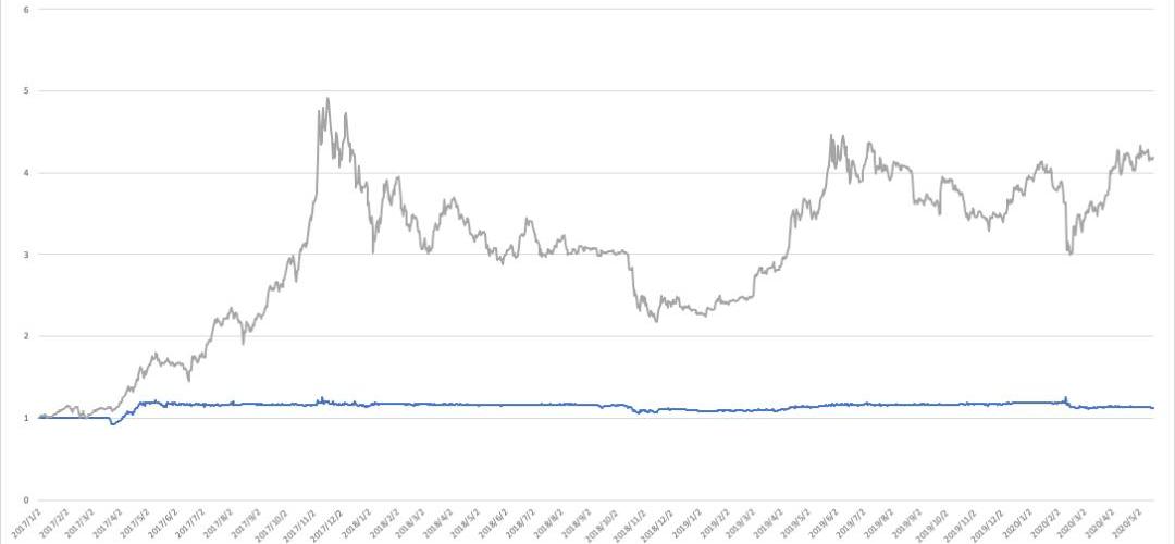 首先,我們選取2017年1月2日至2020年6月16日的BTC和USDT數據,這一步是利用coinmarketcap的close價格實現的。我們同時選取這兩個資產的單獨風險,然后求等權組合標準差。