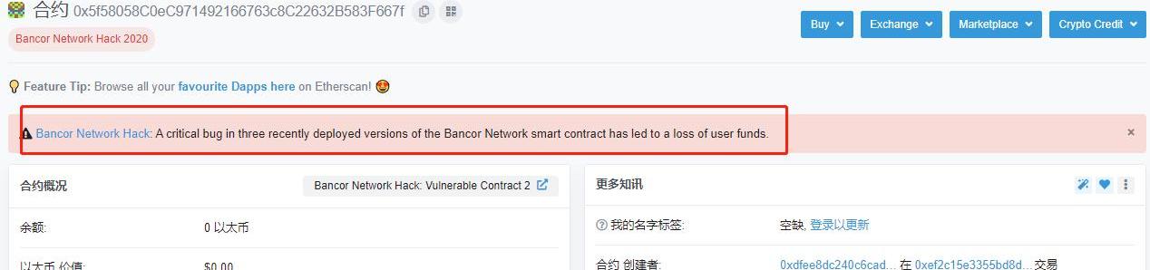 2020-06-18(文中所提及時間均為UTC時間),以太坊上的智能合約BancorNetwork被爆出存在嚴重漏洞。該漏洞由BancorNetwork團隊和白帽最先發現,并第一時間對存在被盜風險的資金進行了轉移,涉及資金50W余美元。