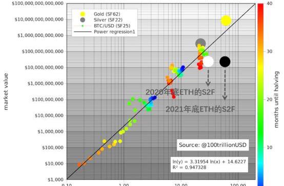 不僅如此,一旦以太坊2.0完全啟動,ETH的S2F值還會在2021年躍升100%至57.2,并于2022年年底繼續上漲至58.2。這一增長趨勢意味著,2022年以太坊的稀缺性將有可能朝著黃金靠攏。