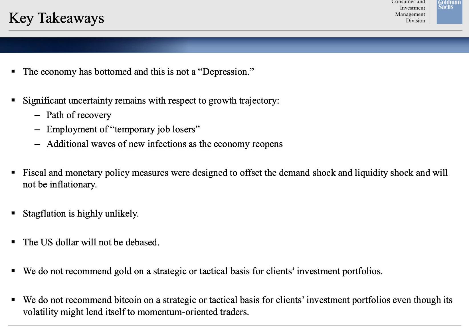 XRP/HKD-3.6%5月27日,投資銀行巨頭高盛舉行主題為《美國經濟預期與當前通脹、黃金,以及比特幣的影響》的電話會議。目前有關這次會議的幻燈片已經在網上公布。本文摘錄編譯了其中關于比特幣的部分。高盛認為,比特幣不產生現金流;在全球經濟增長中不產生收益;也沒有持續的多元化效益;價格極度不穩定;同時也沒有證據表明比特幣可以對沖通脹。此外,這家投資銀行巨頭還表示,包括比特幣在內的加密貨幣并非一種資產類別。