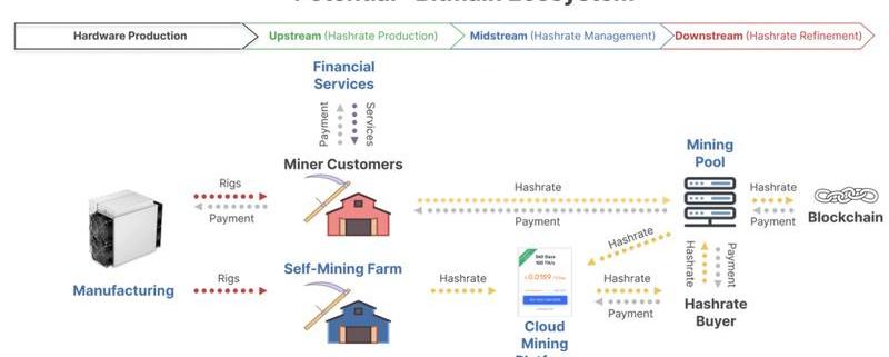Bitdeer是采礦領域中最有意思的公司之一。作為Bitmain的子公司,它處于許多挖礦產品的核心,這包括Bitmain,Antpool,BTC.com,Via.BTC,Matrixport等。同樣有趣的是它使我們得以重新構想算力在礦場,礦池,云挖礦平臺還有買家之間進行交易的方式。從理論上講,算力可以在實際用于網絡上之前經歷多次轉手。以下是一個可能在當今的潛在生態系統。