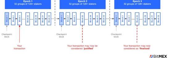 如果在某一階段的所有委員會中,有一個核對點模塊建立在該模塊之上,并且有三分之二以上的委員會成員在投票中提到該核對點,那么該模塊就是"確定的"。最早在一個epoch的三分之二的時候就可以實現。下一個階段是最終化,當區塊鏈一個區塊之后包含兩個確定區塊,該區塊就被最終化了。因此,在大多數情況下,用戶需要等待大約一個epoch的時間來驗證區塊,而最終化則需要等待兩個epoch的時間。如下圖所示。