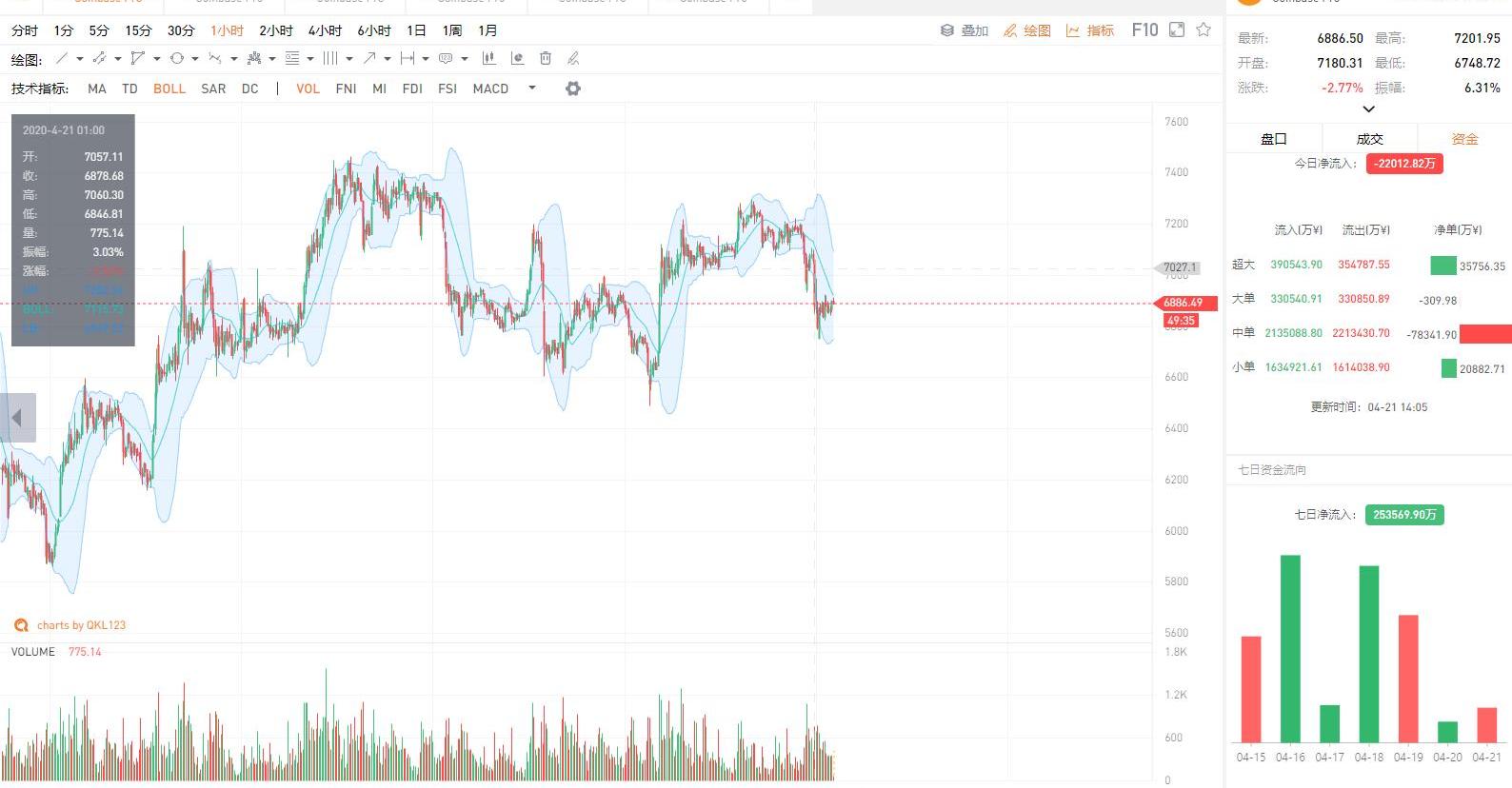 受原油市場極端行情影響,昨晚凌晨BTC聯動下行,從7000美元快速下行至6800美元,最低觸及6700美元,短時釋放的量能并不明顯,目前呈縮量震蕩中。此次聯動回落并未跌破前低,延續區間震蕩為主。