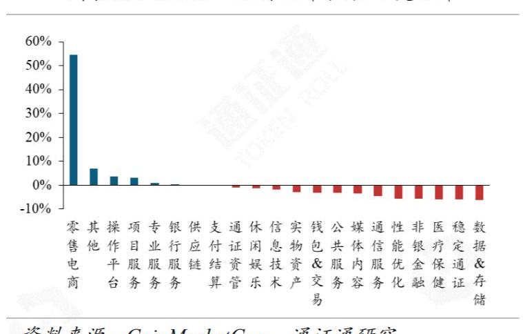 本周通證數量增長較為明顯的BICS二級行業為通證資管、專業服務,下降較為明顯的有通信服務、休閑娛樂。