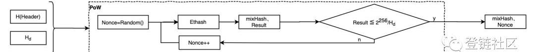 ;2.在PoW開始時選擇一個隨機數作為Nonce的初始化值;3.將Nonce和作為挖礦方程Ethash的入參;4.執行Ethash將得到兩個返回值:mixHash和result;5.判斷result是否高于