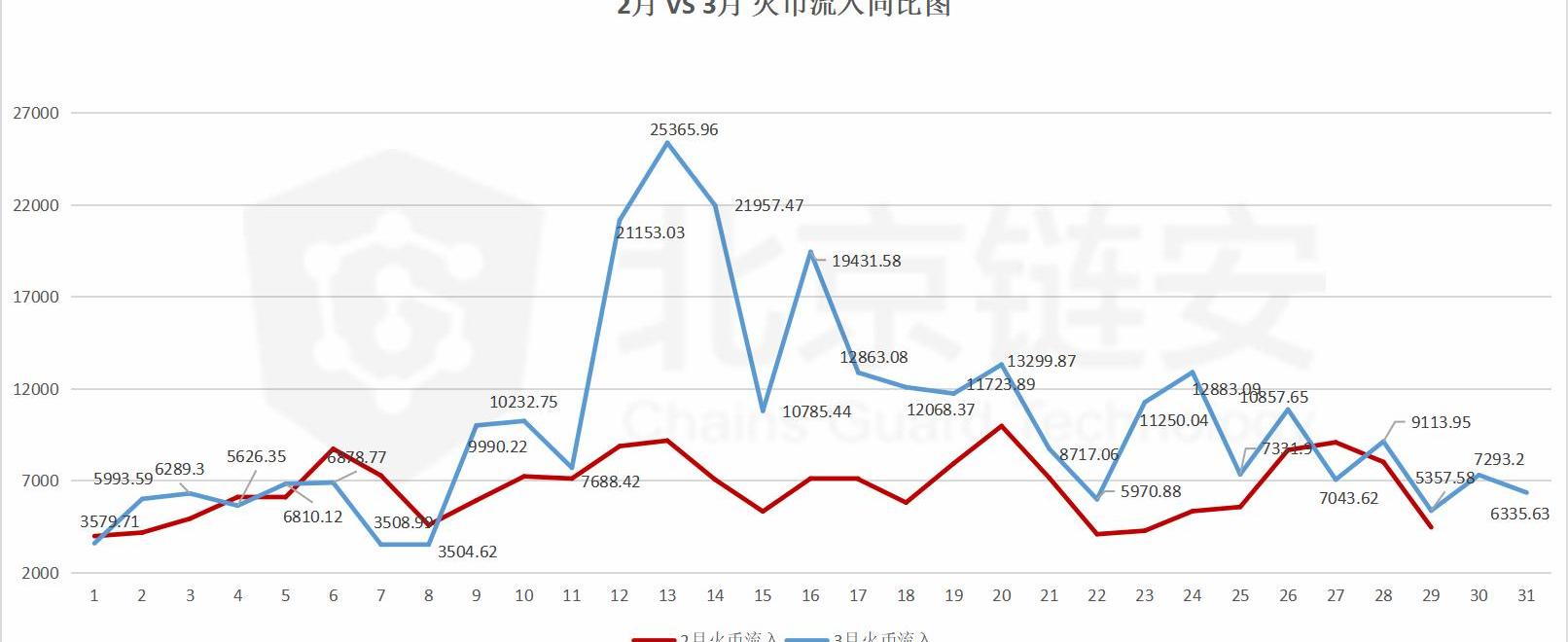 具體比較2月3月火幣的日流入流出走勢來看,同樣在3月12日到3月20日漸數據同比大幅提升。