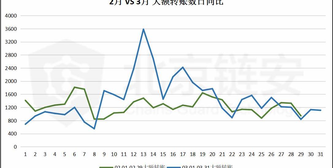 2020年3月的鏈上大額轉賬數為45266次,比2019年2月的36166次上漲了25.16%,3月12日幣價跳水在大額轉賬數方面的影響時間也比交易額更長。