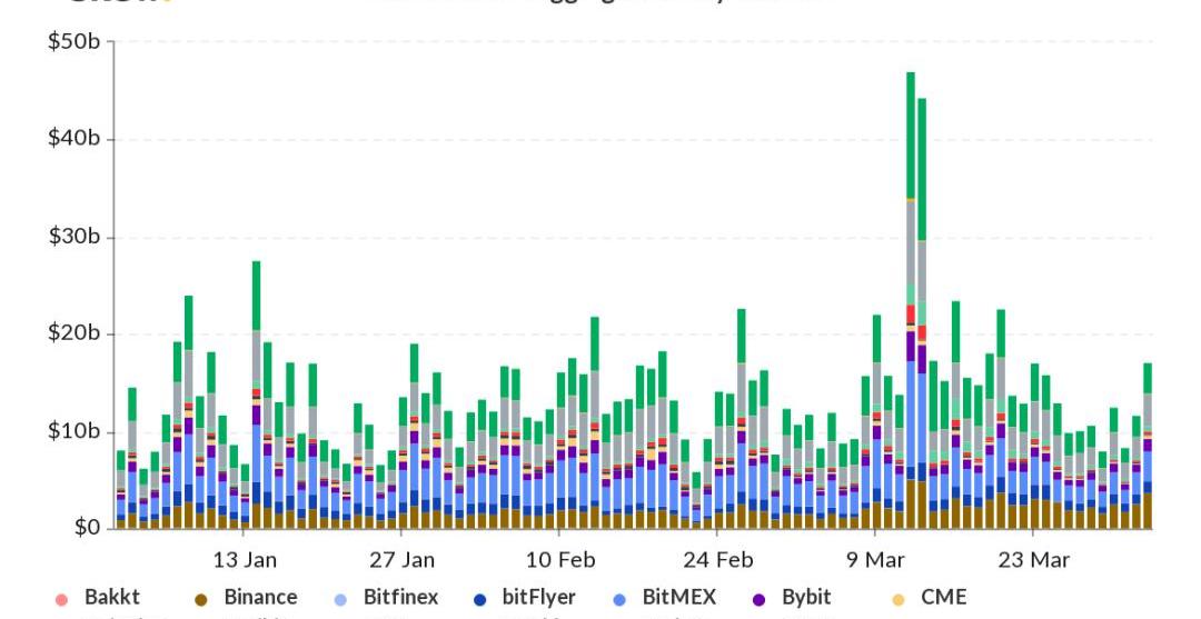 值得注意的是,單日交易量的峰值并未出現在2月,而是3月13日的2500億美元。