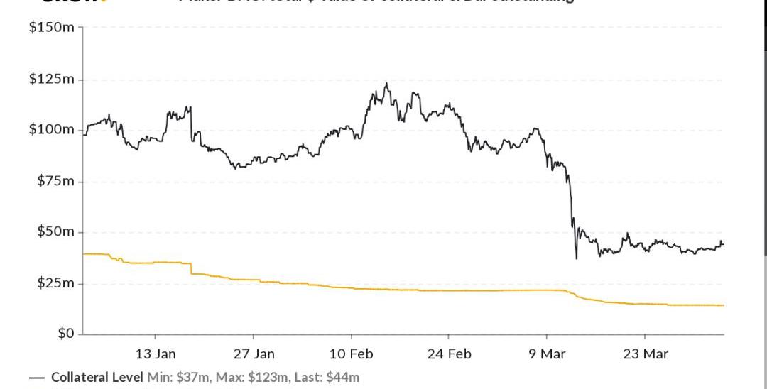 從單個項目來看,MakerDAO上抵押品總價值一直維持在7.5億美元以上,但在3月12日暴跌清算中中抵押品價值一度跌至3.7億美元,季度末收于4.2億美元,季度跌幅達到60.3%。