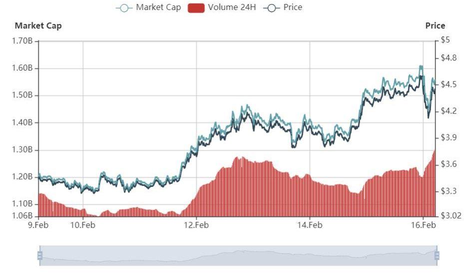 HuobiToken(當前排名16,當前價格4.93美元,周漲幅28.45%)