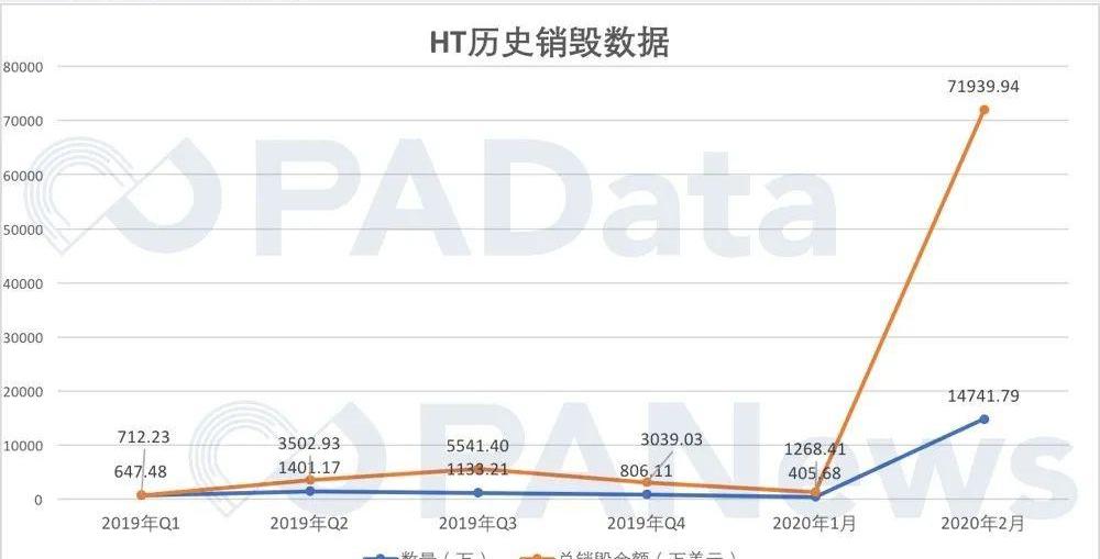 HT從2019年第一季度開始銷毀,截至2月29日最大幅度銷毀,累計銷毀數量為19135.44萬枚,按照每次銷毀時候的HT價格計算,總銷毀市值為8.6億美元。