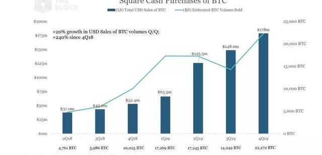值得注意的是,CashApp內置了一個比特幣交易功能。該功能允許用戶在應用內買賣比特幣。CashApp比特幣交易服務去年第四季度為Square帶來了1.78億美元的收入。就2019年全年而言,這家支付公司登記的比特幣交易額超過5.16億美元,折合成毛利潤為800萬美元,比前兩個季度增長了50%。