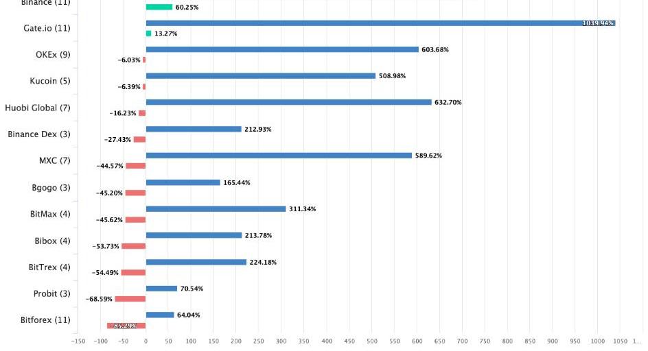 從交易所募資占比來看,Binance為本次IEO熱潮的發起者和中堅力量,從4月份開始,該募資形式在其他交易所得到擴散。
