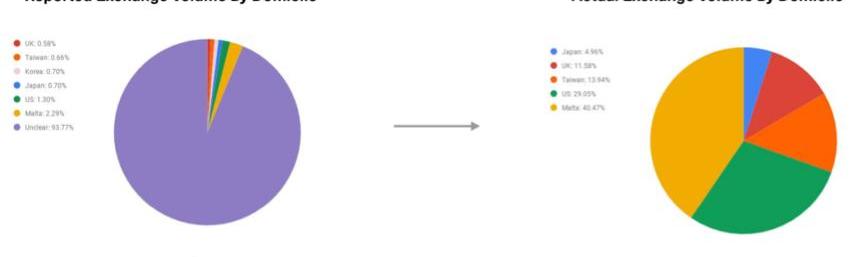 將各大交易所的報告交易量與真實交易量作對比,交易量貢獻主要來自于幣安和歐美主流法幣交易所,而中國非一線交易所普遍刷量造假嚴重。