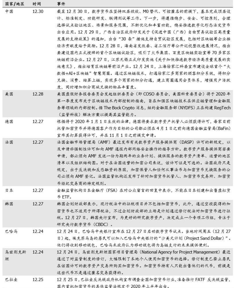 中國:截至12月30日,數字貨幣在堅持雙層投放、M0替代、可控匿名的前提下,基本完成頂層設計、標準制定、功能研發、聯調測試等工作。下一步,將遵循穩步、安全、可控原則,合理選擇試點驗證地區、場景和服務范圍,不斷優化和豐富功能,穩妥推進數字化形態法定貨幣出臺應用。12月29日,廣西自治區政府印發關于《促進中國自由貿易試驗區高質量發展的支持政策》的通知,出臺“30條”措施支持自貿試驗區發展,包括對區塊鏈等企業按經濟貢獻度給予獎勵。12月28日,海南省發改委、省工信廳等公開巡視整改進展情況,指出要建設國內正式授牌的首個區塊鏈試驗區,吸引了火幣集團、百度區塊鏈實驗室等70多家區塊鏈前沿企業。12月27日,江蘇無錫正式印發實施《關于加快推進數字經濟高質量發展的實施意見》,指出培育區塊鏈等前沿產業。12月24日,上海徐家匯科委宣布建設全球首個“大數據+AI+區塊鏈”智慧商圈。通過區塊鏈技術,打通徐家匯多商家的顧客積分系統,將積分兌換、消費、結算上鏈,實現多個商家的積分打通,建立商圈通用會員體系,增強用戶活躍度,同時增加積分商城兌換的物品豐富度。