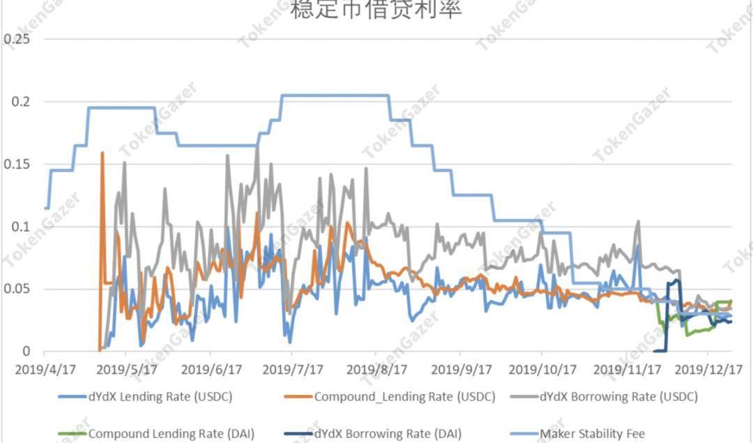 對于以太坊持有者,以前更常采用且規模更大的一種做法是將ETH在Maker中抵押生成穩定幣SAI,再將SAI直接借出或換成其它利率較高的穩定幣借出。從17年12月至18年8月26日以及18年12月17日至19年2月8日,Maker中穩定費的年化費率都只有0.5%。但是目前在Maker中抵押生成DAI/SAI的穩定費費率已經超過直接從dYdX中借DAI的利息。