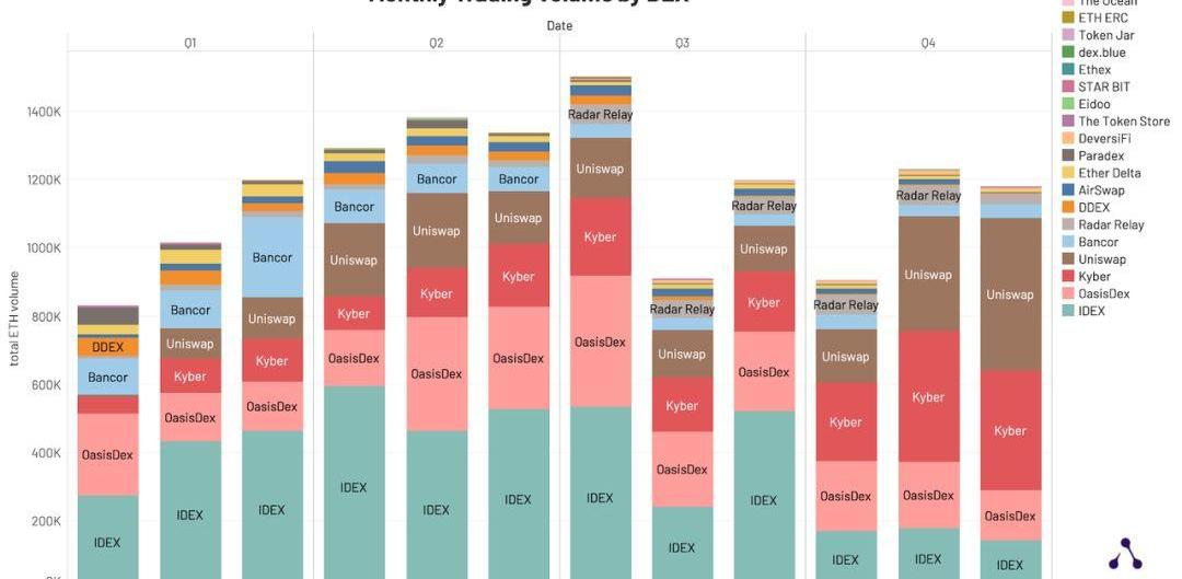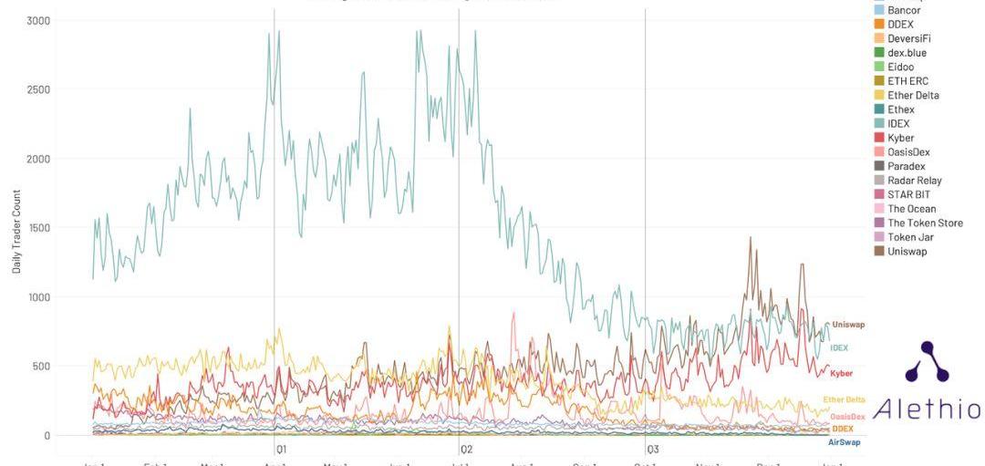 IDEX的交易量在第二季度達到峰值,在第四季度回到每天3000筆交易。Uniswap、Kyber以及Bancor在二三四名的位置上來回廝殺,平均日交易筆數都在約1000~2000筆范圍內浮動。