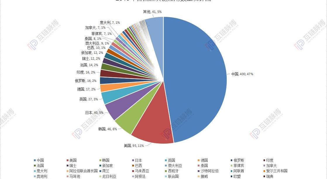 以國為界,世界各國中,中國區塊鏈落地應用數量最多,共400項,占總數的47%。