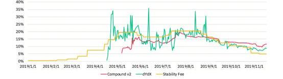 MakerDAO公司設定的穩定費大多高于Compound和dYdX的市場借款利率,直到9月中旬,Compound的借款利率一直低于穩定費。