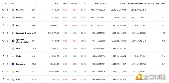 DeFi市值及前十幣種價格本周漲跌幅,數據來源:CoinGecko