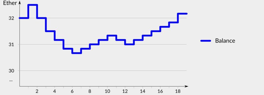 如上文所述,履行了職責的驗證者會獲得獎勵,不履行職責的驗證者會得到懲罰。獎懲情況會反映在驗證者的余額上,正如下圖虛構的驗證者余額變化情況所示: