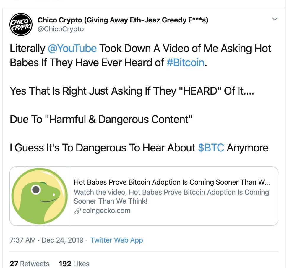 ChicoCrypto表示:“@Youtube錄下了一段我問辣妹們是否聽說過比特幣的視頻。是的,這是正確的,只是問他們是否“聽說過”…。因為“有害和危險的內容”,我想再聽到關于BTC的消息是很危險的。