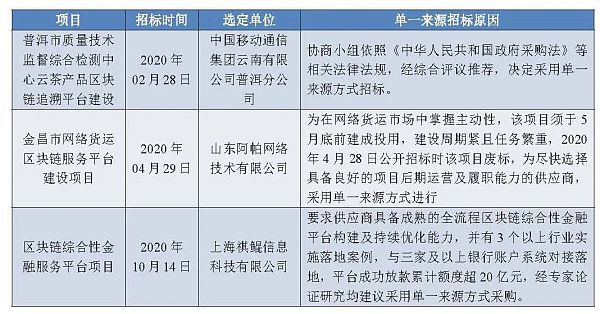 部分項目由于要求較高或需求專一,導致涉及領域較為前沿或該領域供應商有限,難以達到公開招標或競爭性磋商要求,或面臨時間有限問題導致公開招標流程難以開展,經專家認證可采用單一來源招標方式。在政府區塊鏈項目中,共有三個項目采用單一來源方式招標。