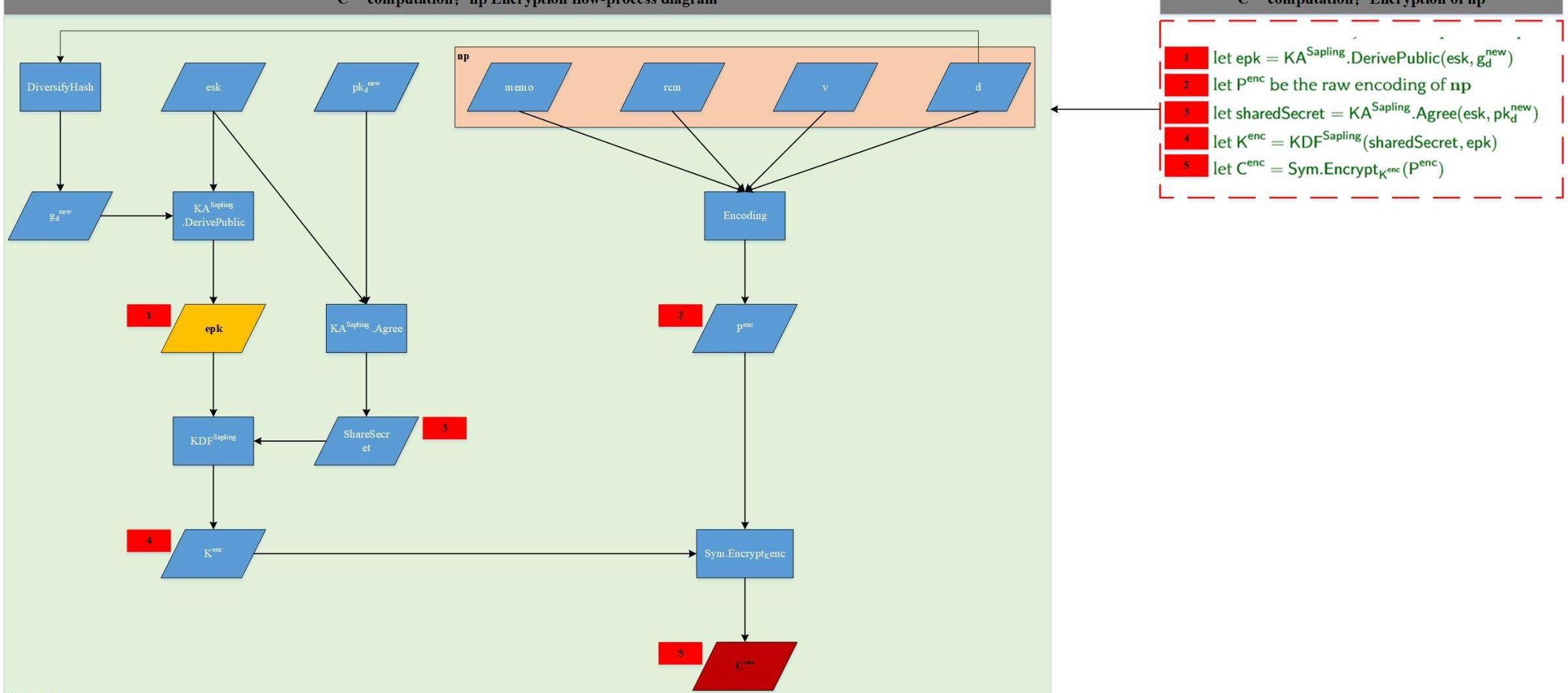 Cenc是encCiphertext,是noteplaint經過對稱密鑰加密后的密文信息,noteplaint是指交易新生成的note的內容,這些內容都是私密的。np的組成及Cenc的加密過程如下圖所示: