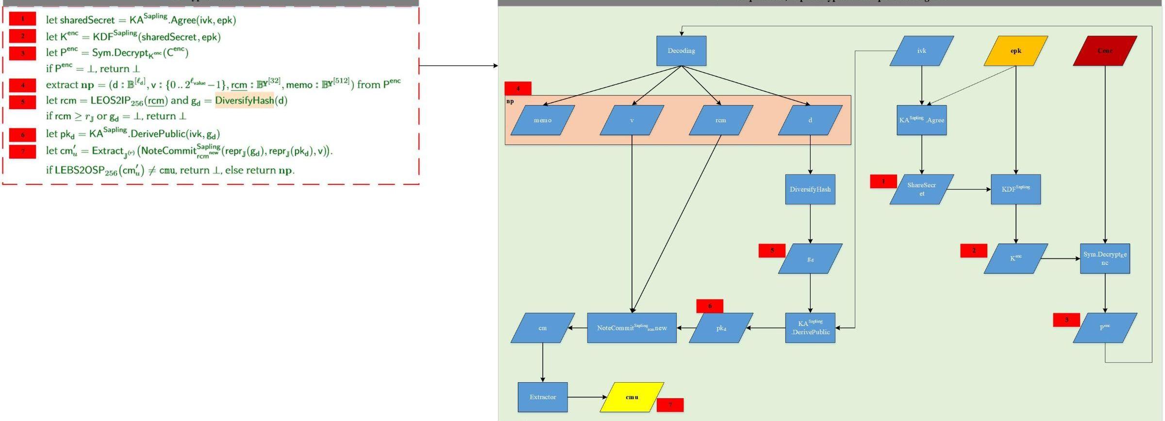 NoteCommit:cm計算函數,原始輸入為np的數據;cm:note的承諾;Extractor:抽取器,返回cm的u坐標,cm形式(u,v);若返回的cmu與outputDes里的一致,則說明證明者有計算cm的私有數據;